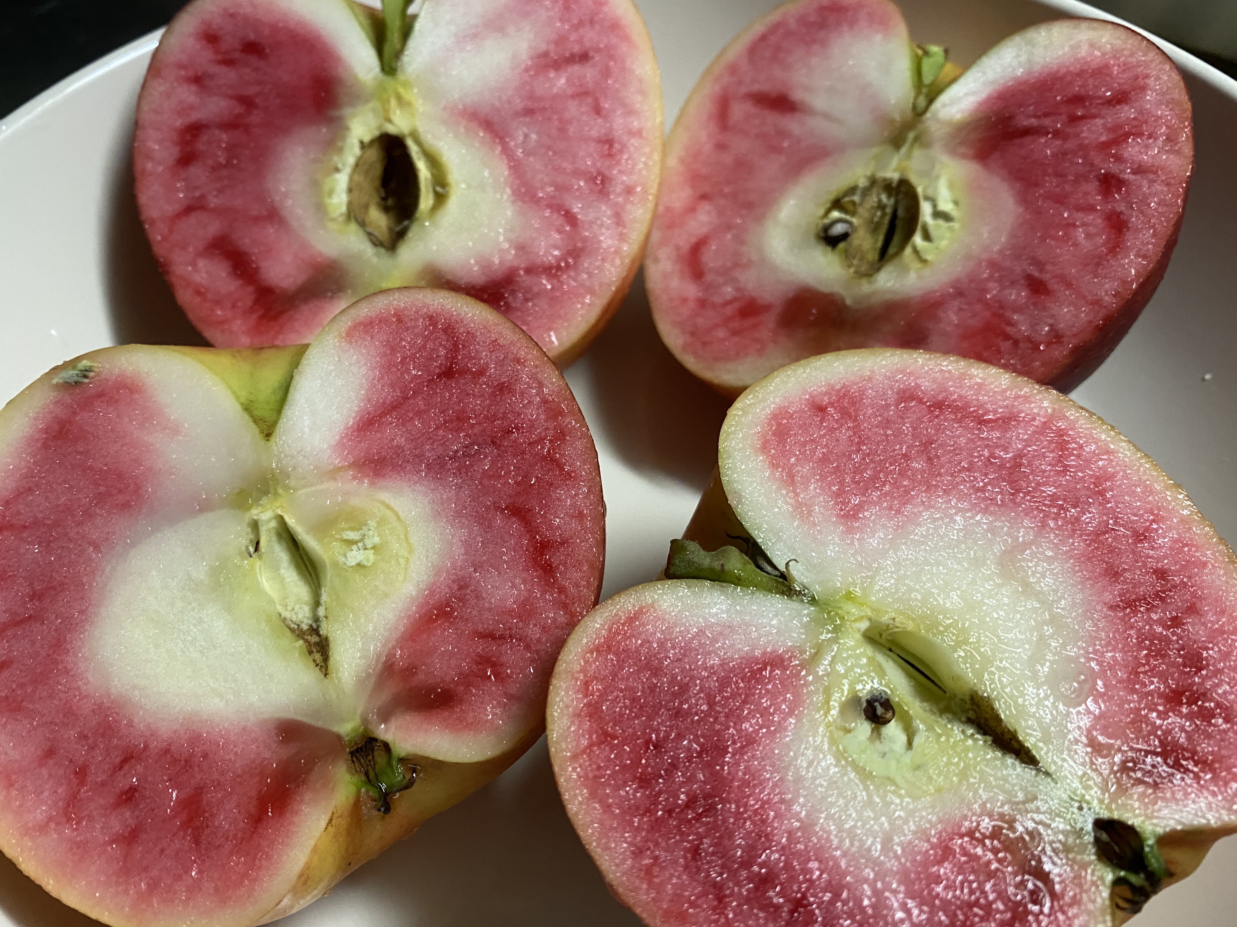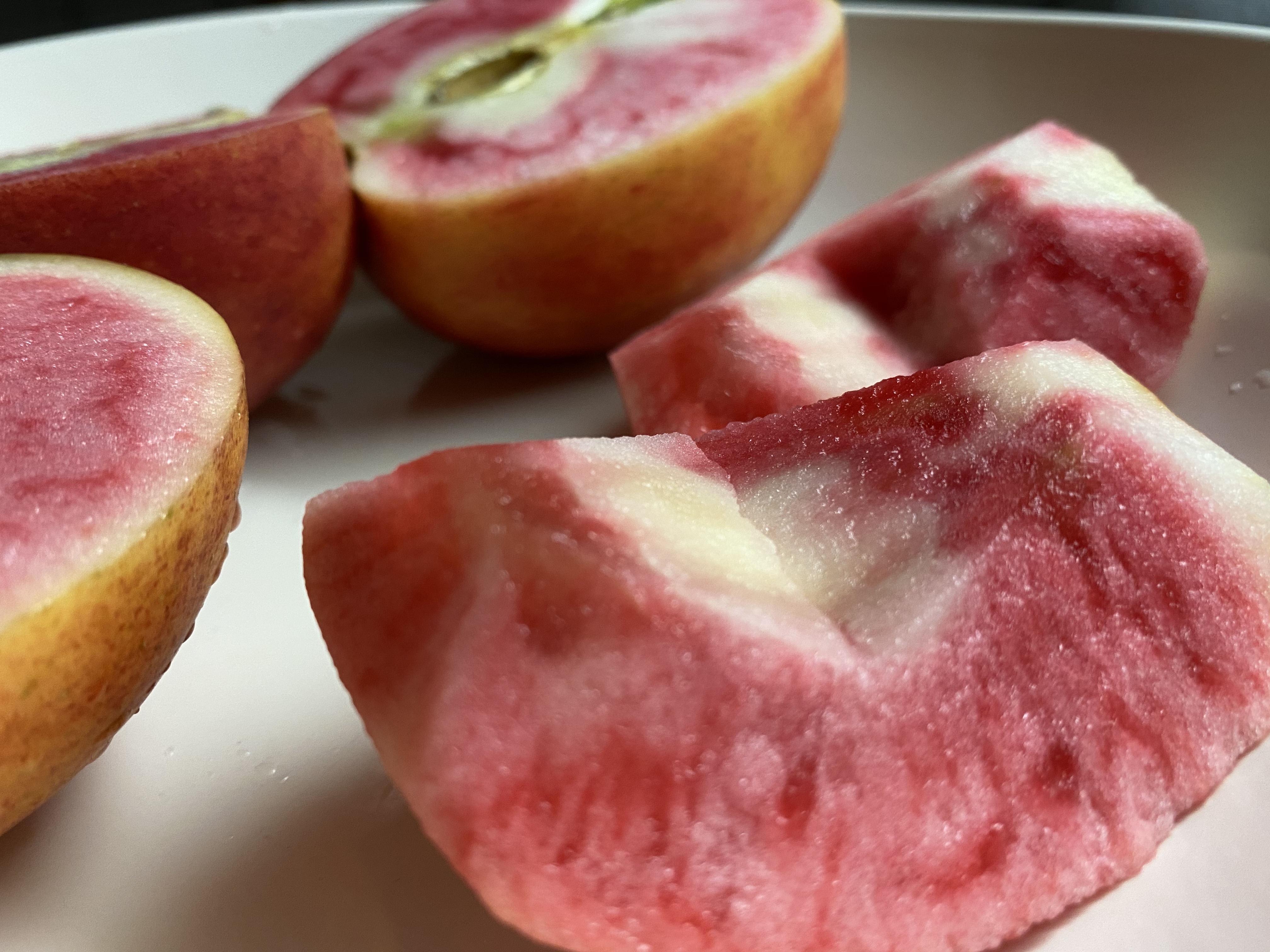 なんて不思議な果実。果肉が赤いだけでも珍しいのに、生でも蜜入りで良い香りがするのよ。