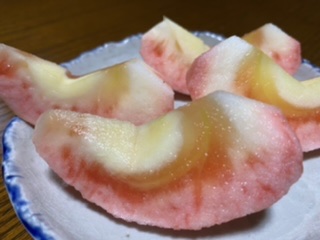 赤い果肉のりんごだよ。ジュースやジャムにしても赤いのねぇ!